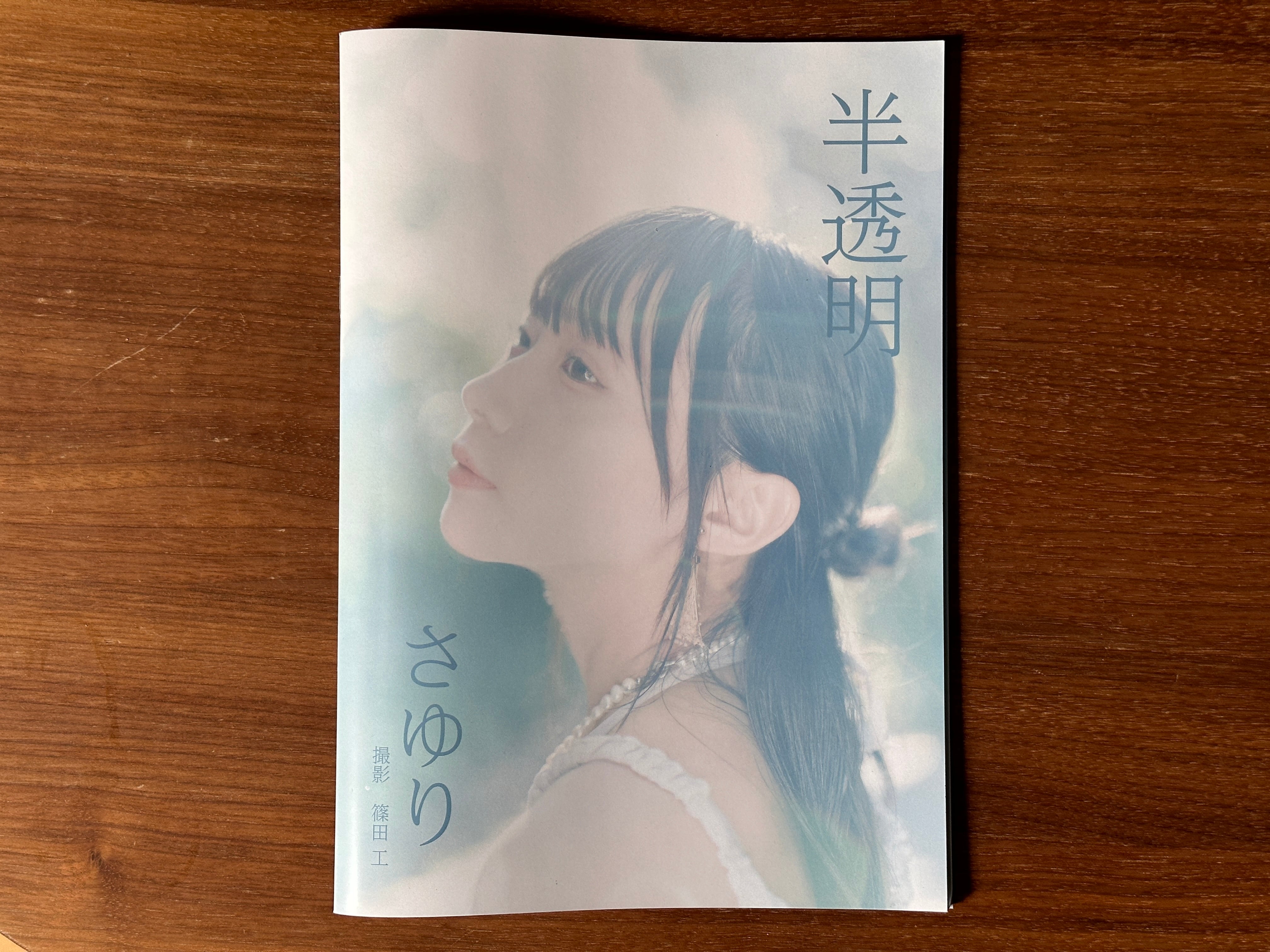 さゆりさんの写真集、『半透明』です。 新島で撮影したフレッシュなさゆりさんをご覧ください。 おへそが見えるかも。 40ページ。